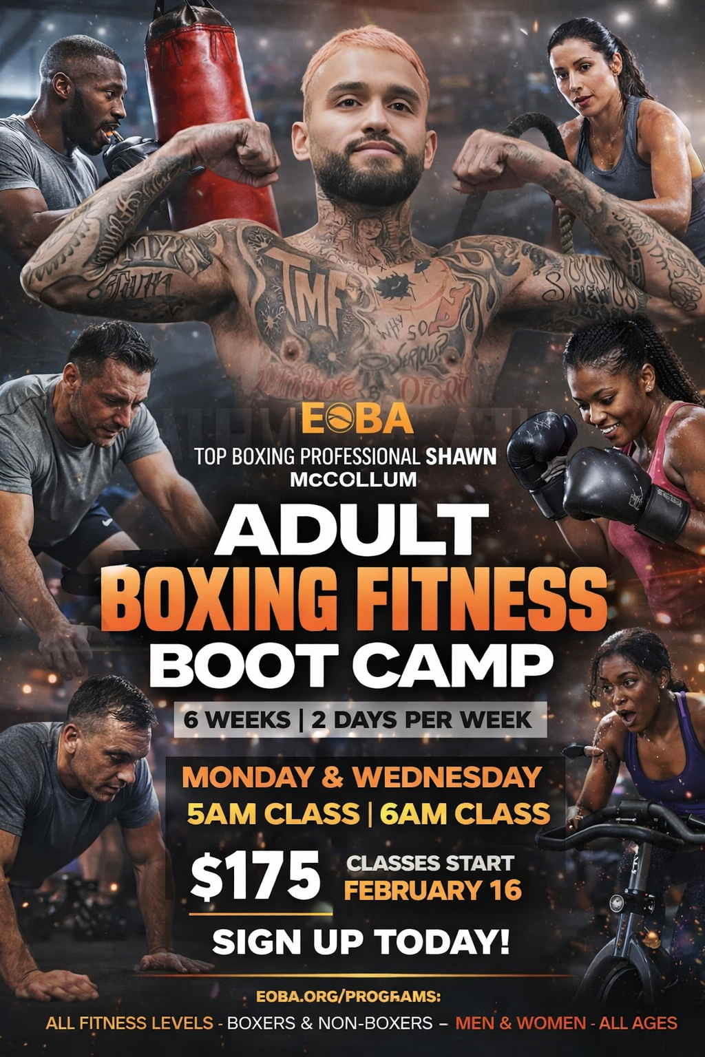 EOBA’s Adult Boxing Fitness Boot Camp is here. Six weeks. Two days a week. Real work. Real bodies. Real change. Led by professional boxer Shawn "Irish Bad Boy" McCullom. Plus, we’re all about YOU. Class size is limited to 15, so you get the attention you deserve. Show up for your body. Fight for your peace. Train like you matter. Spots are limited.