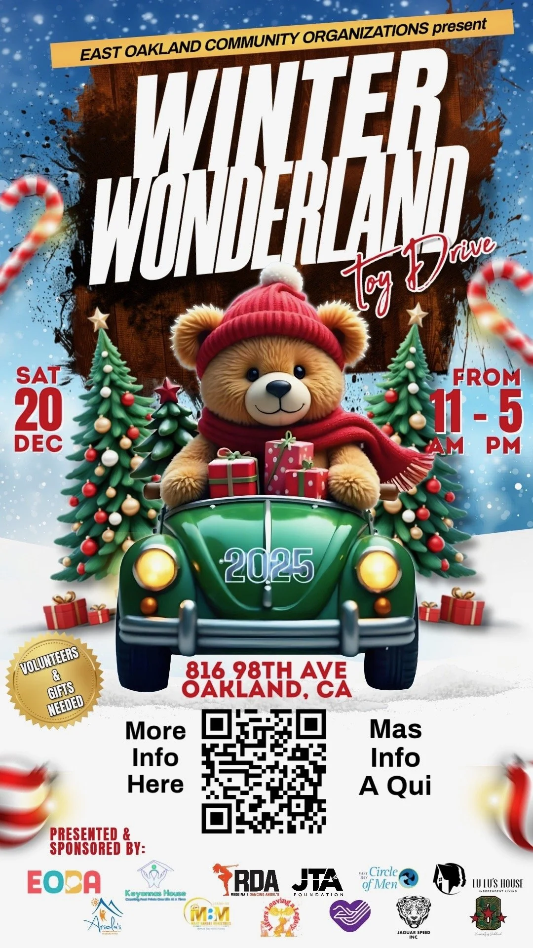(B) Donate unwrapped new toys and gifts: Drop off toys/gifts Monday through Friday from 12 pm to 6 pm to EOBA at 816 - 98th Avenue, Oakland. (Your donation is tax-deductible and you will get a receipt).